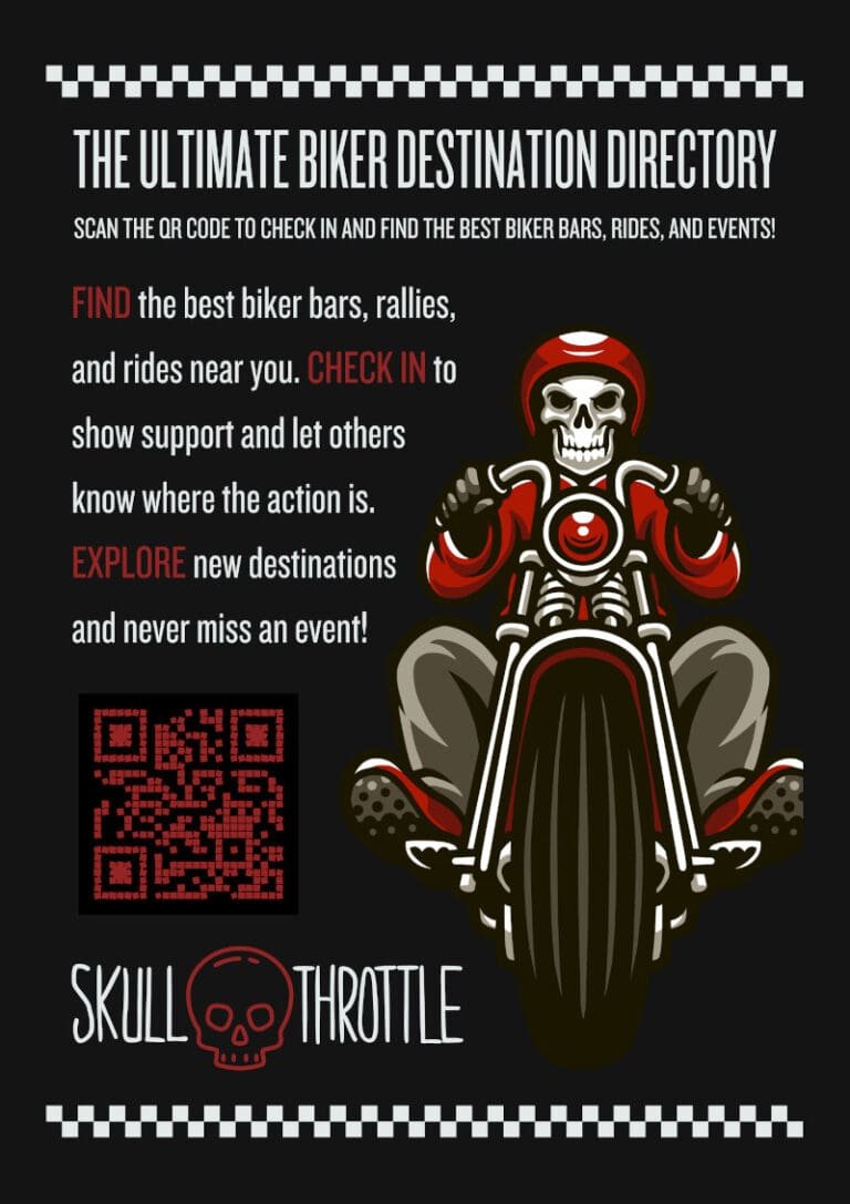 Look for Skull Throttle check-in signs at your favorite biker bars, shops, and event locations. These 4×6 tabletop flyers have a unique QR code just for that spot!